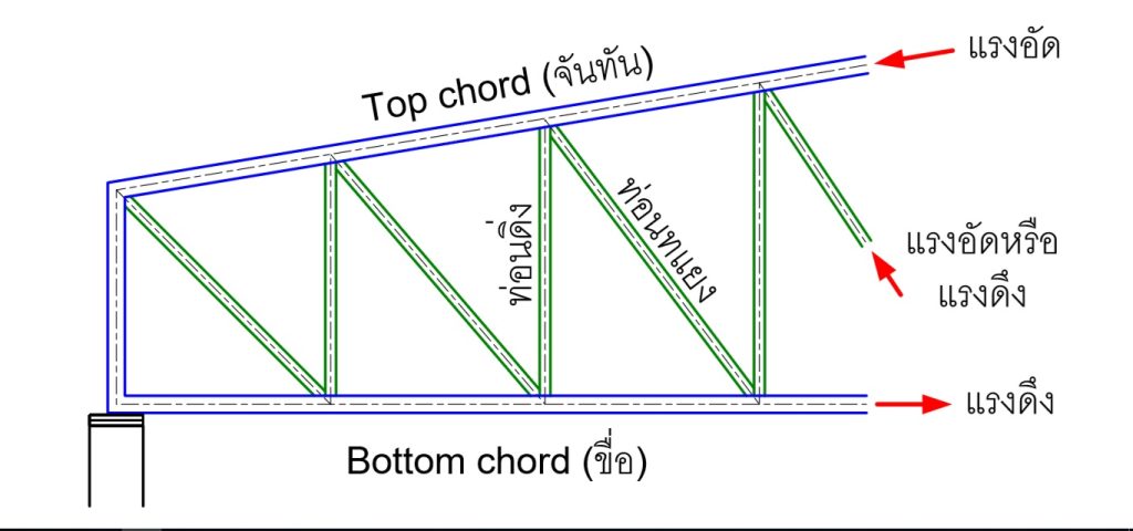การต้านทานแรง ของโครงถัก หรือ โครงหลังคาสำเร็จรูป แต่ละรูปทรง สำหรับโครงหลังคาที่มีช่วงความยาวมากขึ้นจะทำเป็นโครงถักซึ่งประกอบด้วย จันทัน (Top Chord), ขื่อ (Bottom Chord), ท่อนยึดดิ่ง (Vertical Member) และ ท่อนยึดทแยง (Diagonal Member) โดยจันทันจะทำหน้าที่รับแรงอัดเป็นหลัก ขื่อทำหน้าที่รับแรงดึง ส่วนท่อนยึดระหว่างขื่อ และจันทันอาจรับแรงอัดหรือแรงดึงแต่ไม่มาก เท่าจันทันและขื่อ ดังนั้นจึงมักมีขนาดเล็กกว่า