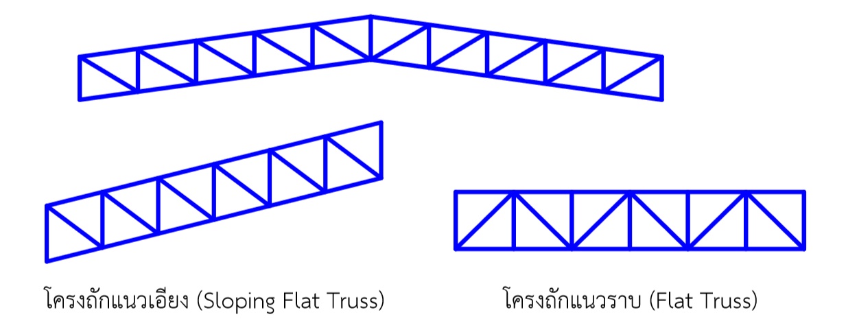 โครงถักแบบเอียงต่างมุม (Dual Pitch) มักใช้เป็นหลังคาอาคารตึกแถว โดยเอียงชันทางด้านหน้า แล้วลาดเทลงยาวด้านหลัง