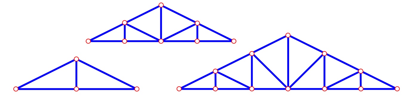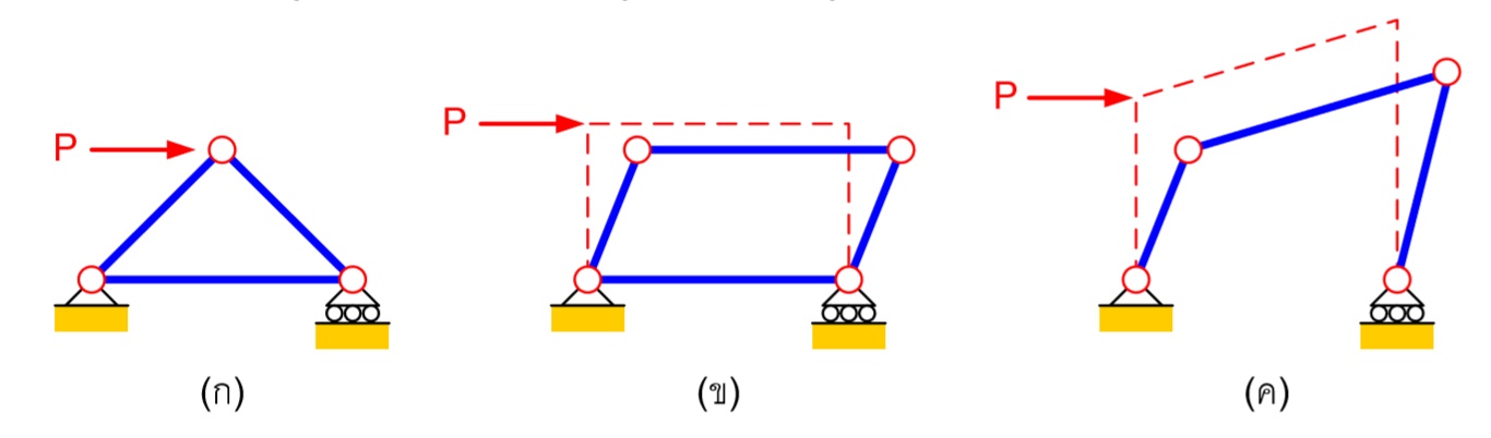 โครงถัก รูปที่ (ก) ซึ่งจะเป็นรูปทรงที่มีเสถียรภาพต้านทานแรง ที่มากระทำให้เปลี่ยนรูปร่าง เมื่อเทียบกับรูปทรงอื่นในรูปที่ (ข) และ (ค)