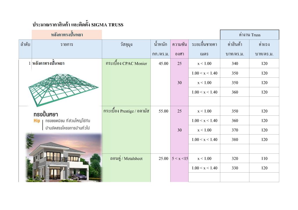 การประมาณราคา คือ การคำนวณงบประมาณค่าใช้จ่ายในการก่อสร้างทั้งหมด โดยการสำรวจหน้างาน ออกแบบ (กรณีลูกค้าไม่มีแบบ หรือเปลี่ยนใหม่) แล้วทำการถอดแบบ โครงสร้างหลังคา เพื่อหาปริมาณวัสดุ ค่าแรง และค่าดำเนินการ ราคาค่าก่อสร้าง การทำโครงหลังคาสำเร็จรูป SIGMATRUSS® จะขึ้นอยู่กับรูปแบบโครงสร้าง รูปทรงบ้าน และ วัสดุโครงสร้างที่ใช้ เกรดเหล็ก สารเคลือบกันสนิม อื่นๆ เป็นต้น โครงสร้างหลังคาที่ซับซ้อน เช่น บ้านทรงปั้นหยา การติดตั้งโครงหลังคาสำเร็จรูป จะทำได้ยากและใช้เวลานานกว่า รูปทรงหลังคาแบบเรียบง่าย อย่างเช่น บ้านทรงหมาแหงน, บ้านทรงจั่ว